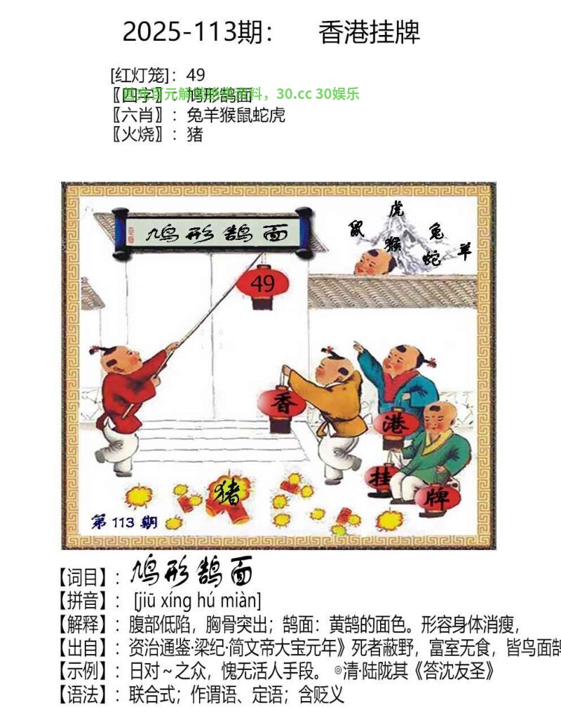 113期〖挂牌成语〗 解释:腹部低陷,胸骨突出;鹄面:黄鹄的面色。形容身体消瘦 生肖:兔羊猴鼠蛇虎 |